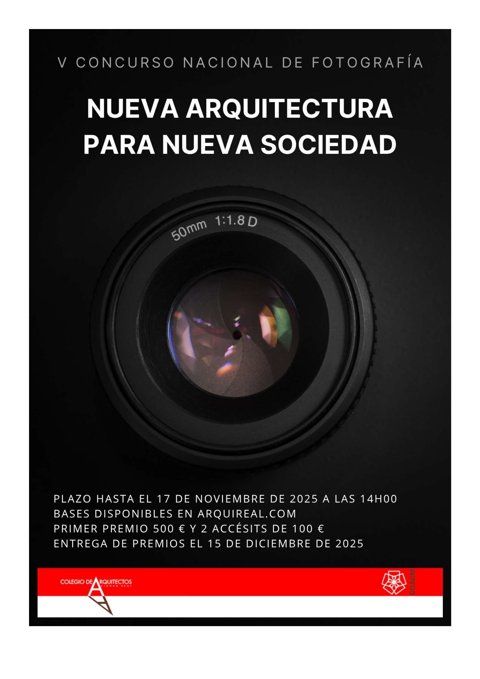 V CONCURSO NACIONAL DE FOTOGRAFIA NUEVA ARQUITECTURA PARA NUEVA SOCIEDAD Plazo hasta el 17 de noviembre de 2025 a las 14h00 Enlace a las Bases del concurso Primer Premio 500 € y dos accésits de 100 € Entrega de Premios el 15 de diciembre de 2025 |